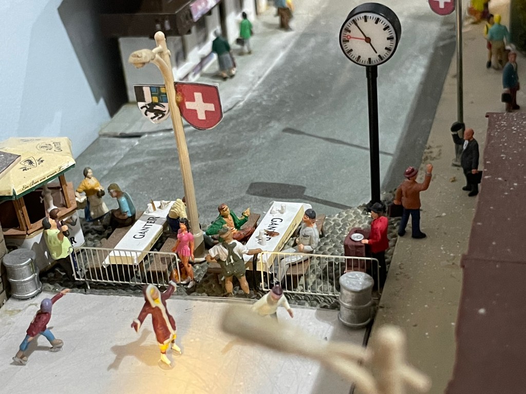 I had acquired some figures courtesy of last year’s Noch Advent Calendar and most of these were installed as part of this project because it was easier to access the ice rink, Christmas market and the station concourse where several of them would be going. I have finally included some passengers with wheeled luggage, a distinctive feature of modern rail transport. It is all beginning to look good now.