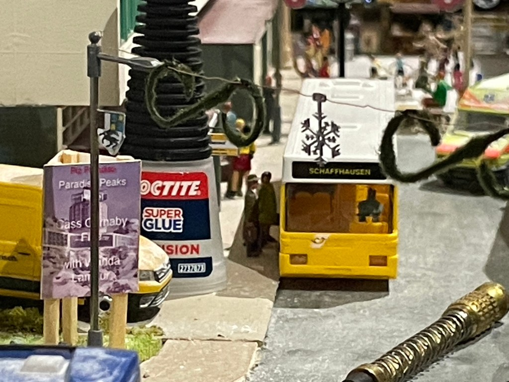 I had to buy a little more track and while at Trains 4 U discovered some HO scale street Christmas decorations which were added to the purchase and have really set the scene at the Christmas market and beer festival in the station square. I am very happy with what I now have and feel I am getting there with an exhibitable layout with some interesting detail to hold attention between trains – vital with a terminus layout where one cannot keep trains running continuously. The back scene now needs painting and the track and overhead tweaking (especially where the layout joins the fiddle yard). Looking forward now to moving back onto developing the mountains and the other two permanent stations!