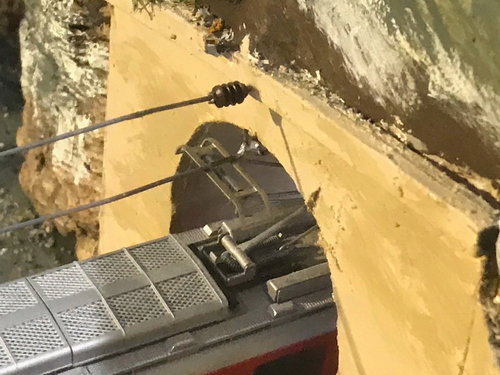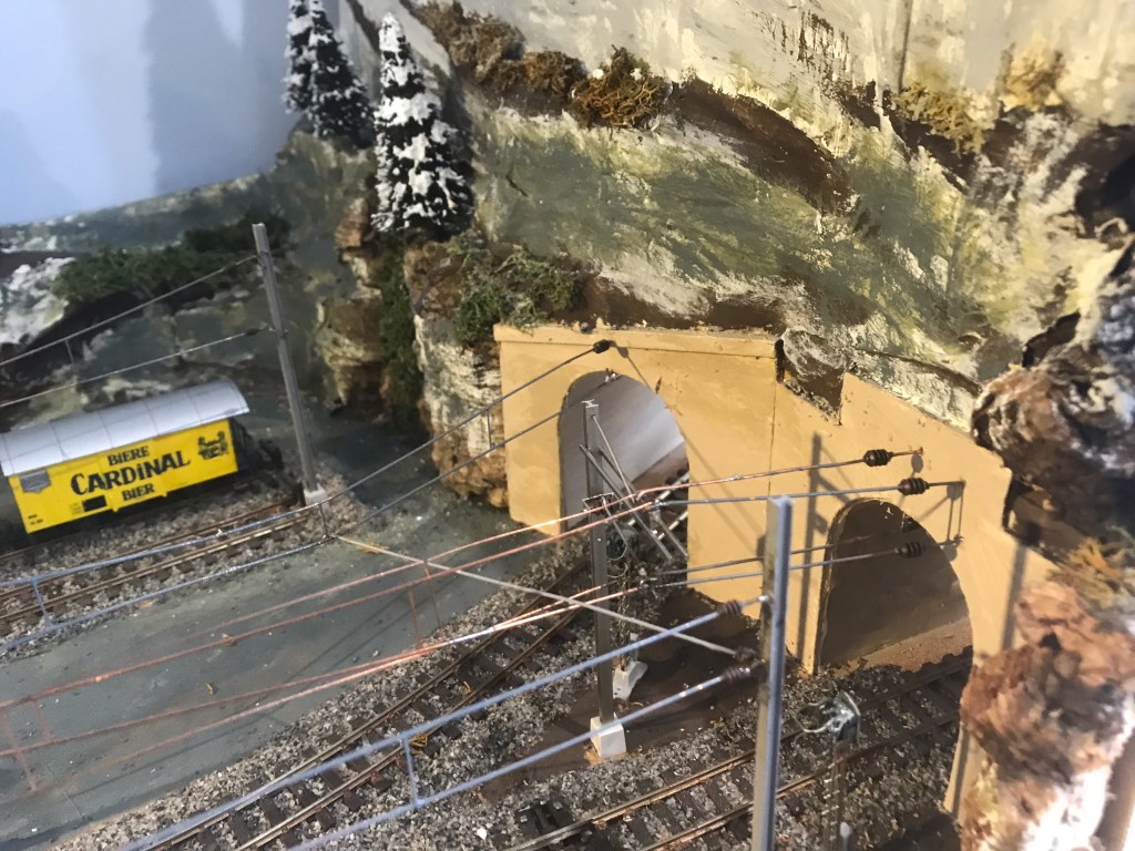 Now that the track is laid I shall have to install the point motors and wiring, position the tunnel mouths and erect the overhead electrification masts to the open stretches of track. For light relief I can build the station buildings and the road. There is to be a level crossing, and there will be a road winding up the mountain pass. There is also the need to take the line onward to the terminal station higher up the mountains. Once that is done, then completion of the mountain scenery becomes feasible. Exciting!