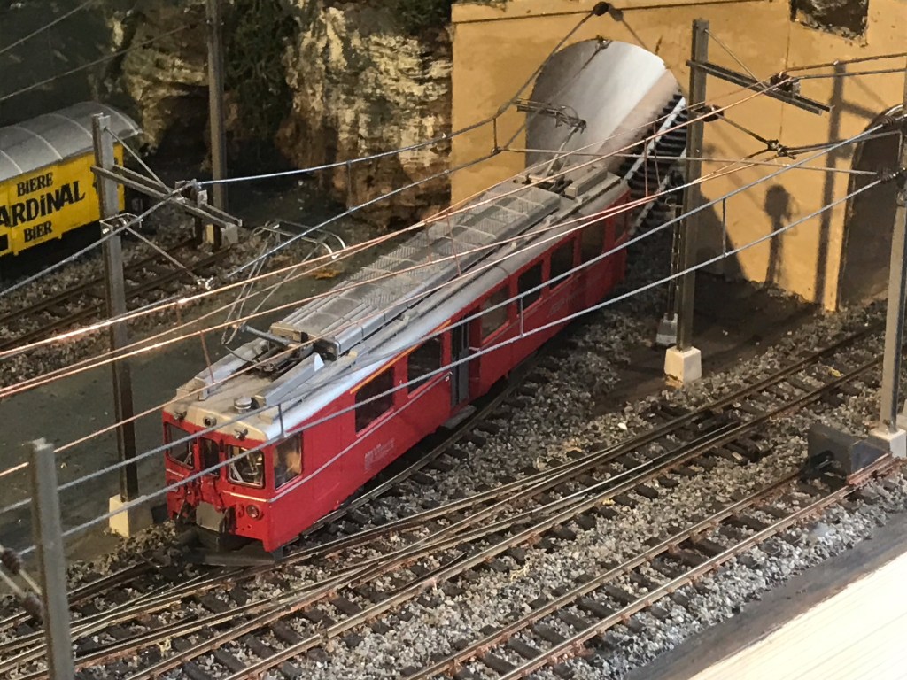 The track base is now complete as far as the intermediate station on the mountain pass line, and slightly beyond, and I have been laying the track and have successfully run trains to and from the station. I had to use flexible track because the fixed-radius curves I have in hand are not small-enough radius to provide the effect I need in the space I have available. It is hard to lay flexible track for such tight curves, but with care it can be done: it tends to tilt and can tip trains off, and it is also not easy to avoid variation in curvature, which can be catastrophic when working so close to the tolerances of the locomotives and rolling stock. I did make a test curve before I designed the layout so I knew that I had some vehicles which could go round these curves successfully, but I also suspected I’d have several that would not and would have to be confined to the other part of the layout!