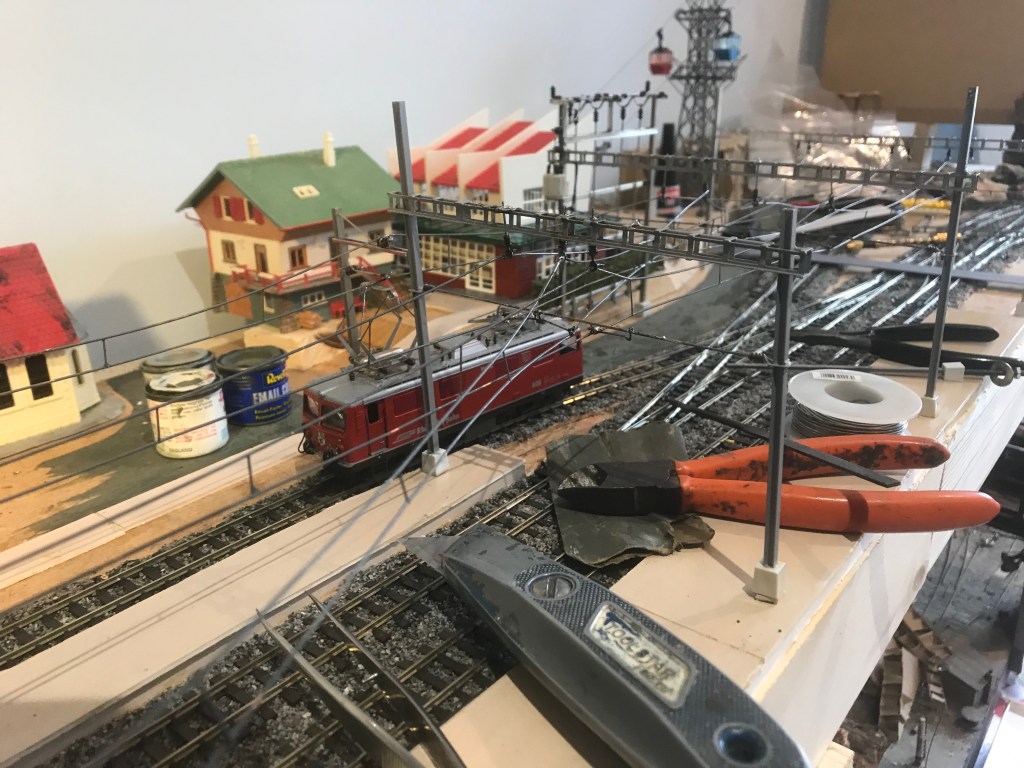 All my previous layouts have used steam or diesel outline locomotives and trains, with just a touch of London Underground third-and-fourth rail electric. So the installation of overhead electrification equipment was quite a challenge. I don’t, or didn’t, know much about overhead electrification at all, and was unaware of the specifics of RhätischeBahn equipment, or even who might manufacture the components I would need. A friend lent me a magazine which recommended some publications which I acquired from Peco Publications, one of which in turn pointed me to Sommerfeldt OHLE and their manual, a 162-page illustrated book which I also bought. I was fortunate to acquire a large job-lot of Sommerfeldt kits and components on eBay. I had to bid a huge sum to make sure of winning it because the alternative of slowly collecting all that I might need was not attractive, but the eventual cost was not too bad for the amount of equipment I was able to buy all in one go. Quite a lot of the manual had English translations alongside the German text, but the diagrams tended to be labelled only in German – and I don’t even know much of the technical terminology in English anyway! Here is how it all went: